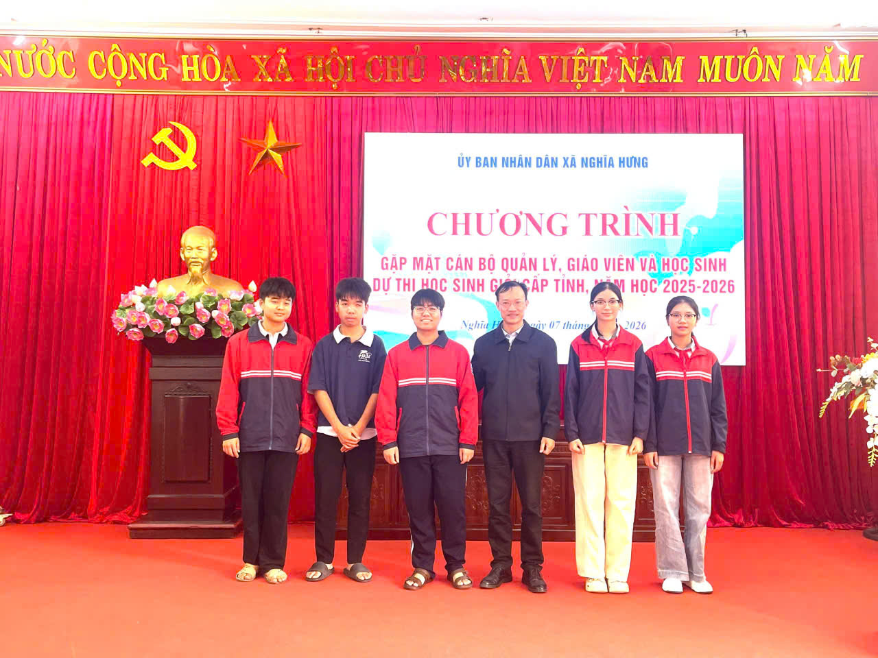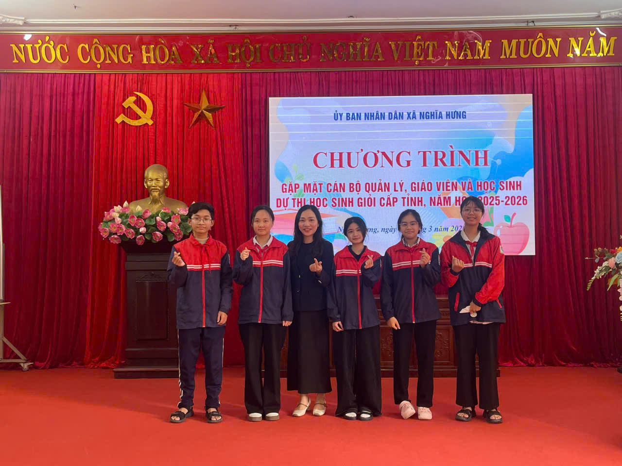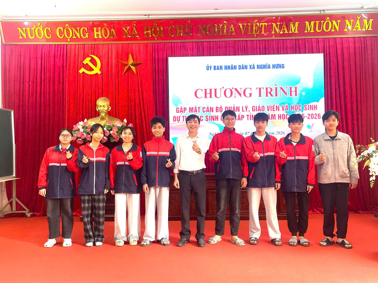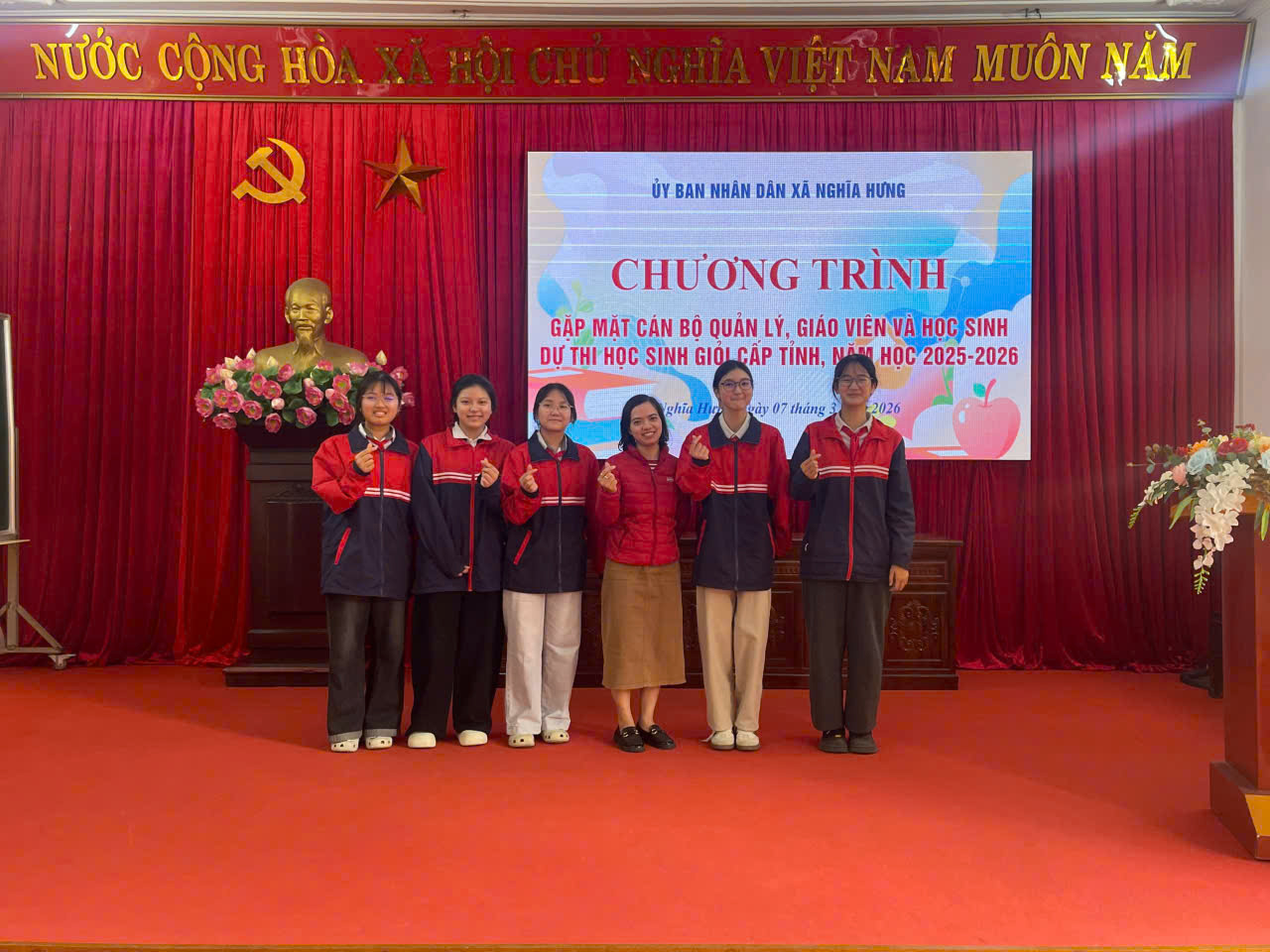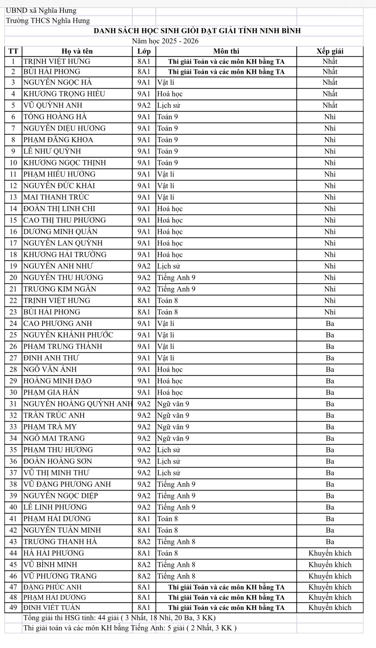 Niềm vui nối tiếp niềm vui, trong kỳ thi chọn học sinh giỏi cấp tỉnh các môn văn hoá khối THCS của tỉnh Ninh Bình được tổ chức vào ngày 10/3/2026 vừa qua, thầy và trò trường THCS Nghĩa Hưng tiếp tục gặt hái được những thành tích đáng tự hào. Toàn trường có 52 học sinh dự thi có 44 em đạt giải, trong đó đội tuyển Vật lý do thầy Nguyễn Văn Nhất phụ trách có 8 học sinh đạt giải: 1 giải Nhất, 3 giải Nhì, 4 giải 3; đội tuyển Hoá học do cô Đinh Thị Tuyến phụ trách có 9 học sinh đạt giải: 1 giải Nhất, 5 giải Nhì, 3 giải Ba; đội tuyển Lịch sử do cô Trần Thị Duyên phụ trách có 5 học sinh đạt giải: 1 giải Nhất, 1 giải Nhì, 3 giải Ba; đội tuyển toán 9 do thầy Phạm Đức Thuận và Nguyễn Văn Trình phụ trách có 5 học sinh đạt giải Nhì; đội tuyển Tiếng Anh do cô Hoàng Thị Thuỷ phụ trách có 5 học sinh đạt giải: 2 giải Nhì, 3 giải Ba; đội tuyển Ngữ văn 9 do cô Đinh Thị Thu Hoài và Phạm Thị Chi phụ trách có 4 học sinh đạt giải Ba; đội tuyển Toán 8 do thầy Nguyễn Văn Trung phụ trách có 5 học sinh đạt giải: 2 giải Nhì, 2 giải Ba, 1 giải Khuyến khích; đội tuyển Tiếng Anh 8 do cô Phạm Thị Ánh Tuyết phụ trách có 1 học sinh đạt giải Ba và 2 học sinh đạt giải Khuyến khích.